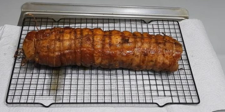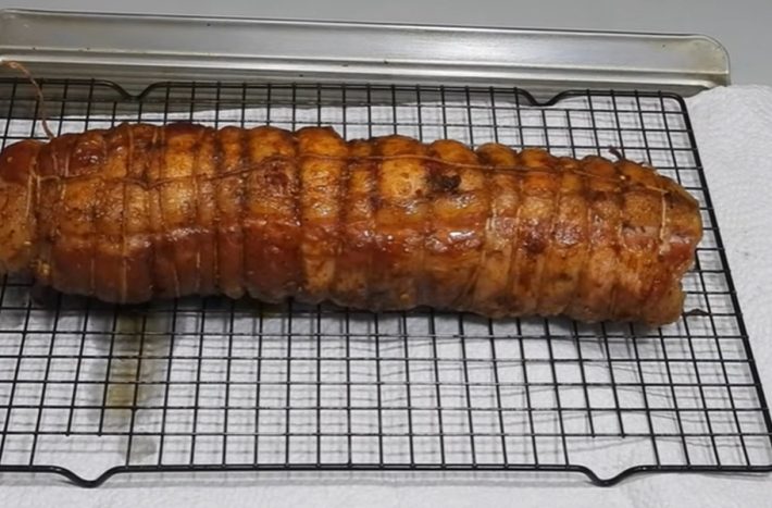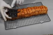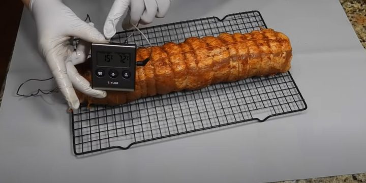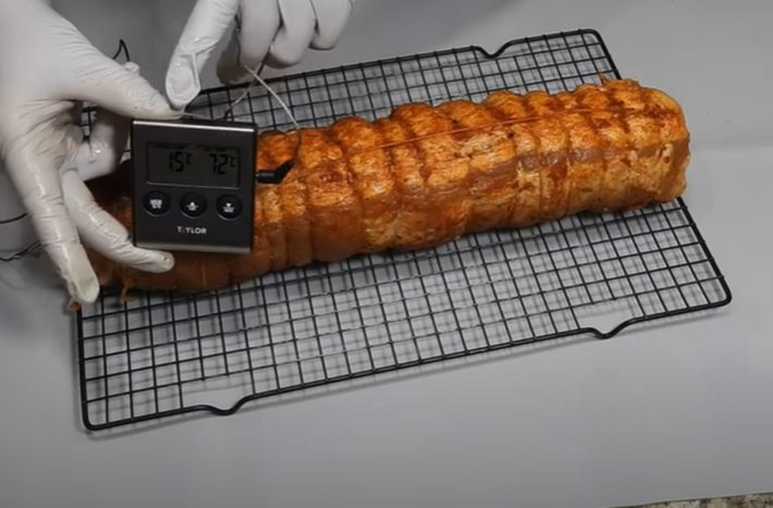 Přesuňte maso na mřížku a do rolády zapíchněte teploměr na maso. V tuto chvíli by měla mít asi 15 stupňů. Dejte ji péct do trouby na 70 až 72 stupňů. Hotová bude v momentě, kdy vám teploměr zahlásí, že má roláda 72 stupňů. Po vyjmutí z trouby nechejte roládu na 10 minut vychladnout.