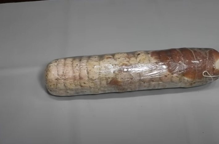 Poté maso srolujte do tvaru rolády a zavažte potravinářskou nití, obalte do potravinářské fólie a nechejte v lednici po dobu 36 hodin. Po uplynulé době roládu vytáhněte z lednice, odstraňte fólii a usušte ji papírovými utěrkami. Smíchejte chilli koření s mletou sladkou paprikou a roládu touto směsí potřete.