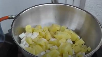 Cibuli s oloupaným celerem a bramborami nakrájejte nadrobno. Zeleninu vložte do pánve s rozpáleným olejem, ochuťte ji solí, pepřem, muškátovým oříškem a smažte ji 3–4 minuty, dokud trochu nezměkne.