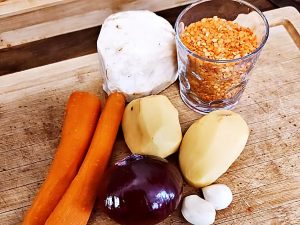 Očistěte cibuli a česnek a nakrájejte je najemno. Mrkev, brambory i celer oloupejte a vše nahrubo nastrouhejte. Cibuli spolu s jemně krájeným česnekem zpěňte na trošce olivového oleje, a když se česnek rozvoní, přihoďte zbylou strouhanou zeleninu. Chvíli vše společně restujte a poté podlijte trochou vroucí vody.