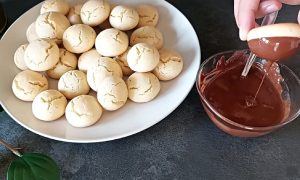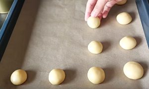 Připravte si plech pokrytý pečicím papírem. Z těsta odebírejte kousky o velikosti pingpongového míčku, zformujte je do kuličky a vyskládejte vedle sebe na plech. Když máte zpracované veškeré těsto, dejte kuličky péct do trouby rozehřáté na teplotu 180 °C po dobu kolem 15 minut, dokud sušenky neztuhnou a na povrchu se nevytvoří typické prasklinky.