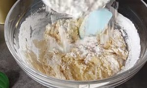 Dvě vejce vyklepněte do misky a vyšlehejte je dohladka s cukrem a špetkou soli. Přidejte lžičku čerstvě nastrouhané citrónové kůry a půl sklenky rostlinného oleje a vše opět dobře rozmíchejte. Nakonec do směsi zapracujte kukuřičný škrob, hladkou mouku a prášek do pečiva a zadělejte pružné a nelepivé těsto. Zpočátku míchejte vařečkou či stěrkou a později pokračujte v hnětení ručně.