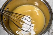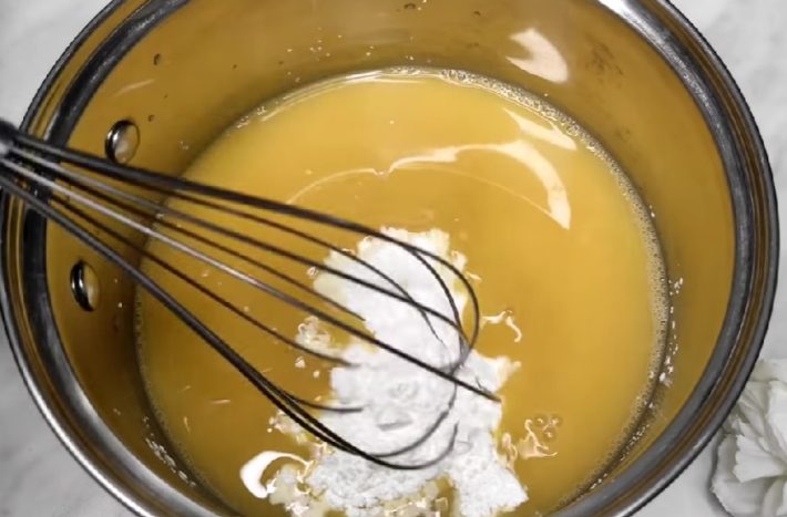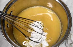 Z pomerančů vymačkejte šťávu, nalijte ji do hrnce, přidejte cukr a kukuřičný škrob a promíchejte. Pak směs za stálého míchání vařte, dokud nevznikne hustý pudink. Do něho ještě dejte rozpustit trochu másla.