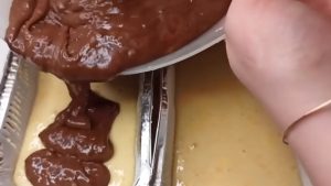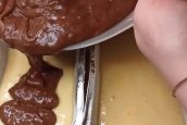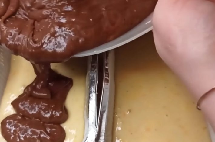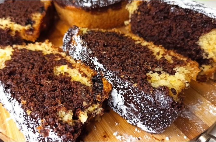 Polovinu těsta nalijte do formy. Pak do druhé poloviny přidejte kakao a promíchejte. Dále do ní vmíchejte džem (ideální je třeba třešňový) nebo i sušené ovoce či ořechy a promíchejte. Nalijte kakaové těsto do formy a mírně promíchejte, aby vzniklo mramorování. Vložte formu do předem vyhřáté trouby na 180 °C a pečte 55 minut. Před podáváním chlebíček pocukrujte moučkovým cukrem.