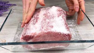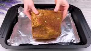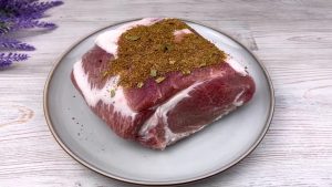 Nasolené maso rozbalte z pekáčku a posypejte ho směsí koření, které rukama rozetřete po celém jeho povrchu. Otočte maso na druhou stranu, přisypejte koření a opět jej rozetřete po zbylých nepokrytých částech masa.