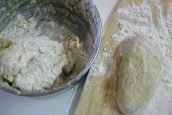 Těsto rukama rychle zpracujte do jednolité hmoty, přičemž postupně přidávejte zbylé množství dětské krupičky. Výsledkem by mělo být hladké a nelepivé těsto. To rozdělte na čtyři stejně velké části, které vyválejte na váleček o průměru asi 5 centimetrů.