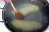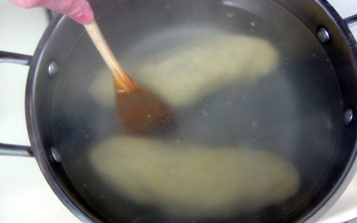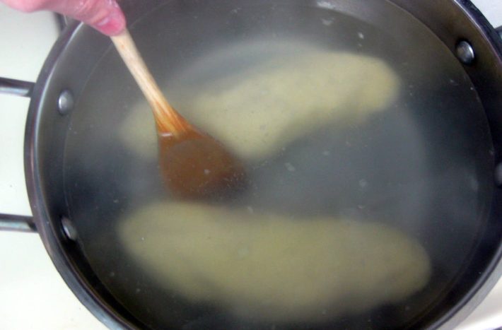 V tu chvíli už by měla voda v hrnci vřít. Knedlíky do ní ihned opatrně ponořte (nenechávejte těsto nijak dlouho odpočívat, protože každá minuta navíc způsobí řídnutí těsta, které může vést k jeho následném rozpadu při vaření). Když voda začne znovu po vložení knedlíků vřít, opatrně je vařečkou odlepte ode dna a vařte 20 minut.