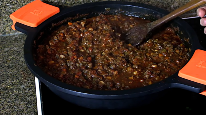 Bůček nebo slaninu nakrájejte na malé kostičky a opečte je na pánvi. Mezitím si nakrájejte veškerou zeleninu nadrobno, a jakmile bůček pustí tuk, přidejte ji do pánve. Opékejte, dokud zelenina nezměkne, a poté osolte špetkou soli. K zelenině přidejte okořeněné hovězí maso. Jakmile se maso zatáhne, přilijte víno a přiklopte pokličkou. Vařte, dokud se alkohol zcela neodpaří, a poté přidejte sekaná rajčata. Jakmile se omáčka začne znovu vařit, stáhněte plamen na minimum, přikryjte a nechte dusit. Občas promíchejte a vařte asi 3 hodiny. Na závěr dokořeňte a na zjemnění přilijte mléko.