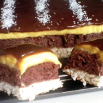 Když máme hotový krém a upečené korpusy, můžeme začít skládat dort. Nejdříve by měl jít kokosový korpus, poté kakaový a pak vanilkový krém. Pokud vám jednotlivé korpusy nebudou na sobě držet, můžete je potřít tenkou vrstvou krému a „přilepit“ k sobě. Celý dort polejeme čokoládou, kterou si připravíme následovně:
