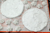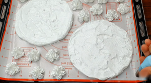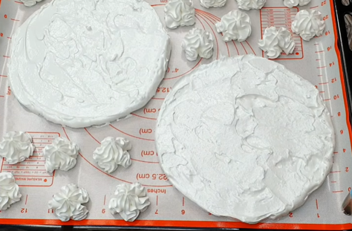 Připravte si formu o průměru cca 17 centimetrů bez dna a podložte ji pečicí podložkou nebo pečicím papírem. Z připravené bílkové směsi odeberte část do zdobicího sáčku. Zbylou připravenou směs rozdělte na poloviny a vytvořte s pomocí stěrky vrstvu, kterou uhlaďte do roviny. Poté zvedněte formu a vytvořte ještě druhou vrstvu obdobným způsobem. Na papír vytvořte pomocí zdobicího sáčku menší pusinky (cca 15 ks). Předehřejte troubu na 100 °C a dejte plech péct na cca 2 hodiny, pravidelně kontrolujte, zda se pusinky vysušují – nesmí se spálit nebo zhnědnout. Pusinky i vrstvy na dort by měly zůstat sněhově bílé.