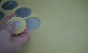 Mezitím si připravte lískové oříšky, které vložte do formy na pečení a nechte je v troubě upražit dozlatova. Pokud jste oříšky pražili v hnědé slupce, je možné, že se speče do černa, to je ale v pořádku. Vyndejte těsto z lednice a vybalte ho z igelitové fólie. Odlomte z něho polovinu, kterou rovněž rozdělte na dvě půlky a každou z nich rukama prohněťte a pak rozválejte válečkem do tenké obdélníkové placky. Kruhovým či vroubkovaným vykrajovátkem z těsta vykrájejte kolečka, která položte na plech vyložený pečicím papírem. Když je plech plný, vložte ho do trouby vyhřáté na 190 °C a pečte sušenky 7 až 12 minut.