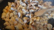 Na rozpáleném oleji smažte na kousky nakrájené kuřecí maso, které ochuťte solí, pepřem a mletou sladkou paprikou. Po 4 minutách přidejte k masu nakrájené žampiony a pokračujte ve smažení další 3 minuty.