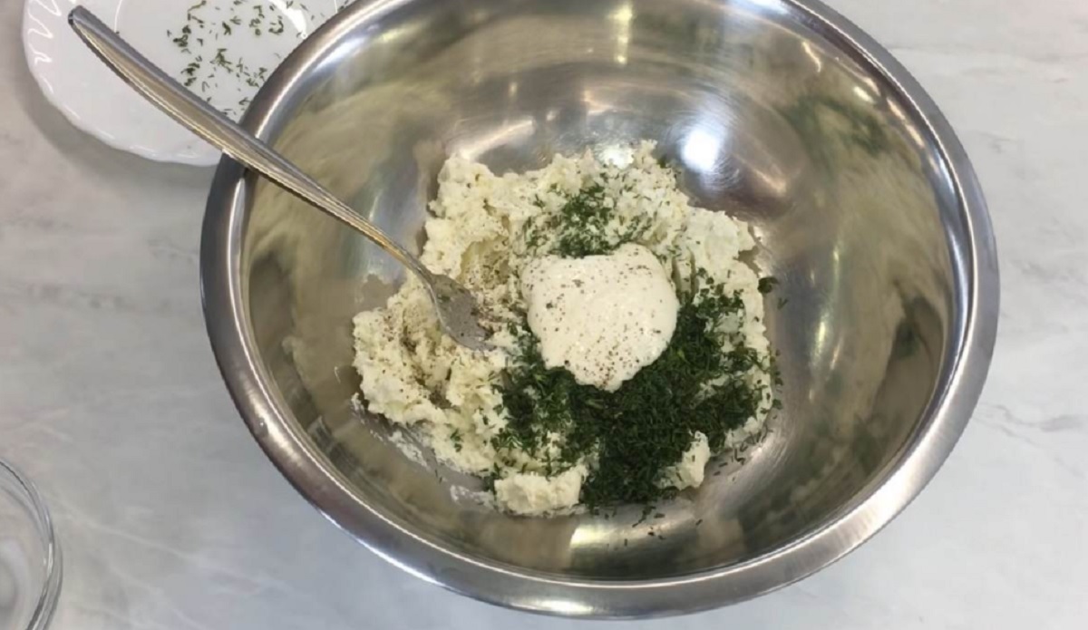 Smetanový sýr, zakysanou smetanu, jemně nasekaný kopr, prolisovaný česnek, sůl a mletý černý pepř podle chuti vložte do misky. Velmi dobře promíchejte.