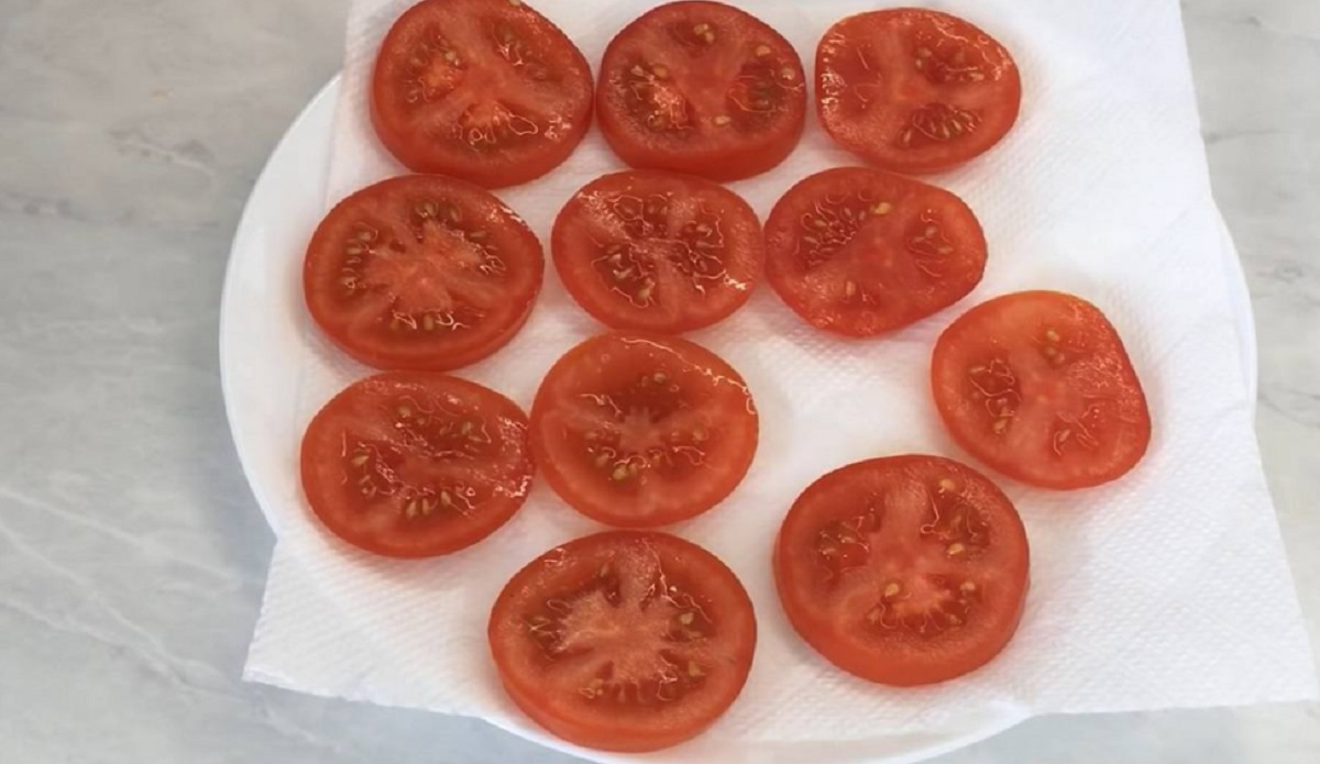 Rajčata nakrájejte na plátky. Dejte pod ně papírové ručníky nebo ubrousky, aby lehce nasákly přebytečnou šťávu z rajčat.