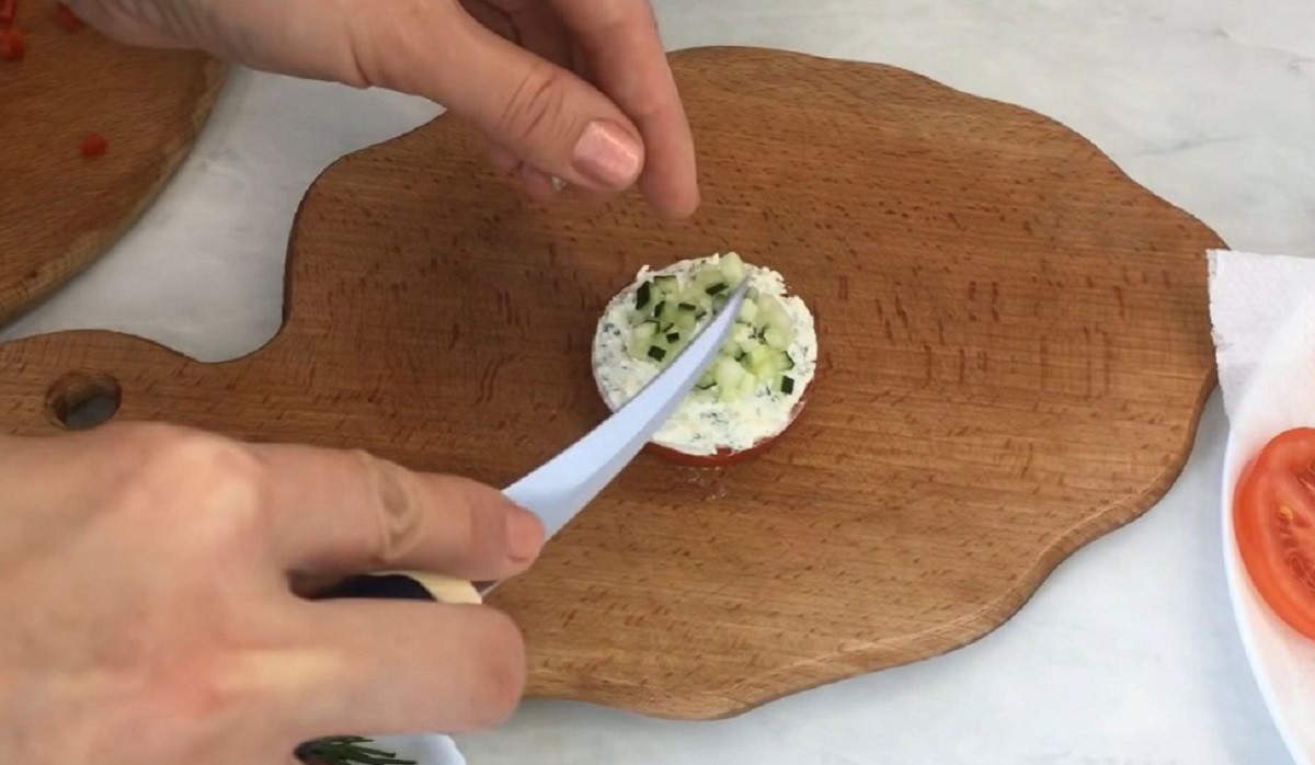 Nyní můžete vše zkompletovat dohromady. Na plátky rajčat naneste sýrovou směs a rovnoměrně ji rozmažte. Poté přidejte na kostičky nakrájenou papriku a okurky.