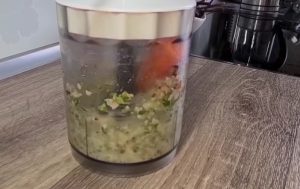 Cibuli nakrájejte na středně velké kostičky. Rozpalte na pánvi trochu oleje a dejte cibuli smažit, dokud hezky nezesklovatí. Pak ji nechte vychladnout. Do mixéru dejte koriandr, feferonky, oloupaný česnek a přidejte vychladlou cibulku. Vše rozmixujte najemno.