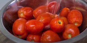 Z červených dobře uzrálých rajčat musíte nejprve sloupnout slupku. Ve vrchní části je nařízněte do kříže, dejte je do dostatečně velké mísy a zalijte horkou vodou. V ní je nechte 3 až 4 minuty stát. Plody poté z vody vyndejte a slupka půjde velmi jednoduše sloupnout. Odřízněte i spodní část. Rajčata poté namelte mlýnem na maso, případně je můžete rozmixovat v mixéru.
