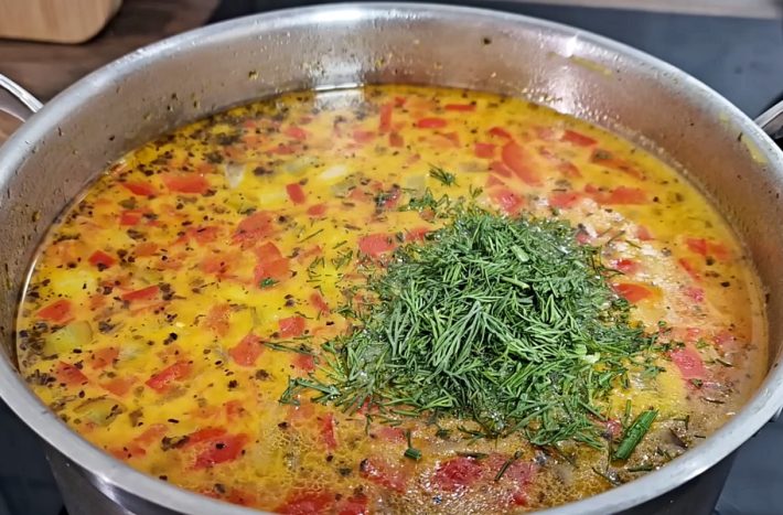 Nasekejte nadrobno kopr, vmíchejte ho do povařené polévky, vypněte oheň a nechte ji pár minut odpočinout. Poté polévku rozdělte do talířů a podávejte.