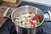 Očistěte chilli papričku a dva stroužky česneku, obojí nasekejte nadrobno a vhoďte do hrnce s ostatními přísadami. Nakonec přihoďte nadrobno nakrájené brambory, vše zalijte 1,5 litrem vody, promíchejte, přiklopte pokličkou a nechte 15 minut vařit.