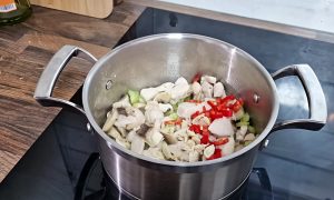 Mezitím nakrájejte na drobné kousky jeden řapík celeru (můžete jej nahradit i kouskem celeru bulvového) a přihoďte jej do hrnce s restovaným masem. Přidejte také žampiony nakrájené na menší kostky. Promíchejte a nechte vše společně opékat.