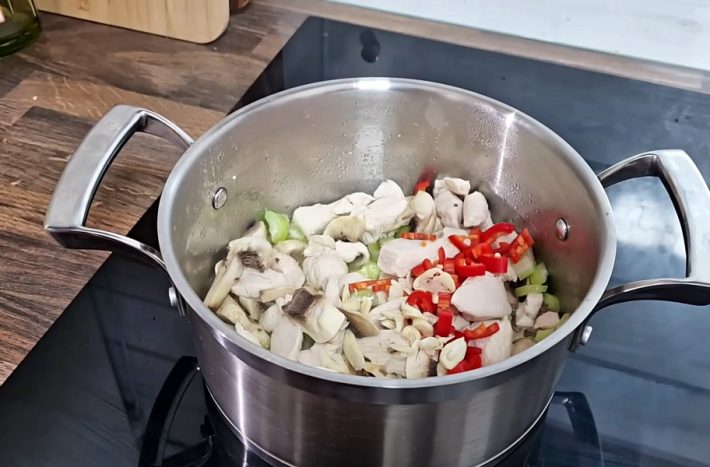 Kuřecí prsíčko nakrájejte na kostky. V hrnci rozehřejte trochu olivového oleje s malou kostičkou másla a nechte v této směsi orestovat nakrájené kuřecí maso dozlatova.