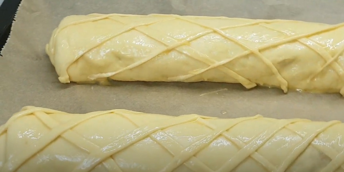 Poté okraje ohněte dovnitř a stočte do role. To samé udělejte s druhým kusem těsta. Rolády položte na plech vyložený pečicím papírem švem dolů.