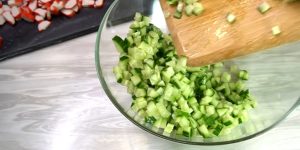 V první řadě si připravte všechny potřebné suroviny na salát. Krabí tyčinky nakrájejte na kolečka. Salátovou okurku nakrájejte na kostičky. Vše dejte do hluboké mísy, ve které budete salát připravovat a míchat. Měla by být dostatečně velká, jinak vám to půjde těžko a budete chytat jednotlivé ingredience po kuchyni.