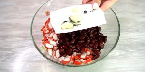Přidejte k tyčinkám a okurce také červené fazole (scezené a okapané od šťávy). Česnek prolisujte lisem anebo stroužky nasekejte najemno. Nakonec přidejte do mísy domácí majonézu a vše promíchejte. Tímto postupem připravíte samotný salát. Na to, byste ho mohli udělat, musíte mít samozřejmě k dispozici domácí majonézu, na kterou se podíváme teď.