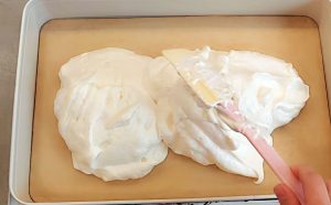 Směs ještě stěrkou jemně promíchejte a vyklopte ji do obdélníkového plechu o rozměrech 24 x 37 cm, vyloženého pečicím papírem. Bílkové těsto rozetřete do roviny a vložte ho do trouby rozehřáté na teplotu 180 °C péct po dobu 20 minut. Po dopečení horké těsto polijte 5 až 6 lžícemi mléka.