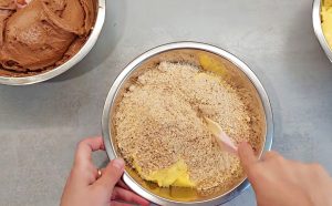 K vychladlému pudinkovému krému zašlehejte na kostičky nakrájené máslo a vytvořte hladký krém. Ten rozdělte na 3 stejné díly. Do jedné misky přidejte ke krému rozpuštěnou tmavou čokoládu promíchejte krém do světle hnědé homogenní směsi. Do druhé misky s krémem vmíchejte rozemleté lískové (či jiné) ořechy. Třetí krém zůstane tak, jak je.