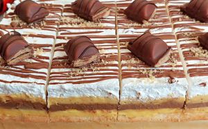 Tyto řezy vypadají na první pohled mnohem složitější, než jaké ve skutečnosti jsou. Křehké těsto je z větší části z vaječných bílků a na něm sedí tři vrstvy pudinkového krému, ochuceného čokoládou a mletými lískovými oříšky. Povrch dortu pak zdobí silná šlehačková vrstva zdobená čokoládovými cákanci, ořechy a tyčinkou Kinder Bueno. Tento dezert je lahodný a velmi pohledný a určitě udělá radost každému strávníkovi i podarovanému oslavenci.