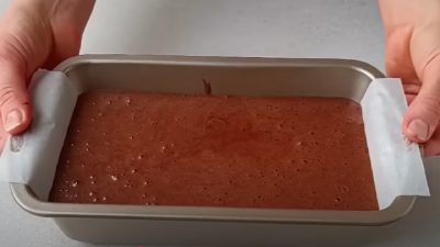 Do kakaové hmoty vmíchejte polovinu vaječné pěny, poté moučnou směs a nakonec zbytek pěny. Těsto vlijte do formy na pečení, vyložené pečicím papírem a pečte ho v předehřáté troubě na 160 °C po dobu 45 minut.