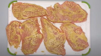 Maso potřete hořčicí z obou stran, obalte ho ve strouhance, poté ve vejci a smažte ho na rozpáleném oleji 2 minuty z každé strany. Poté řízky přendejte na plech, vyložený pečicím papírem.