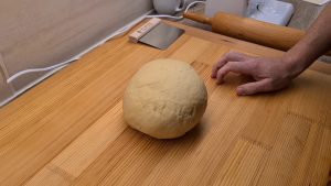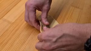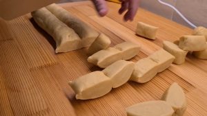 Hotové těsto, rozdělte na dvě poloviny. Z každé se následně vytvaruje váleček, který se rozkrájí na 16 kousků (celkem jich tedy bude 32). Každý kousek se zformuje do kuličky. Všechny se přikryjí fólií a nechají se chvíli odpočinout.
