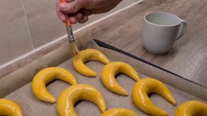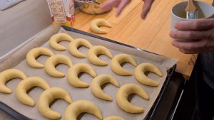 V tu chvíli se zabalí a vytvarují do podoby menšího rohlíku. Ty se vyskládají na plech, dostatečně od sebe, jelikož těsto při pečení ještě nakyne. Připravené rohlíčky se potřou rozšlehaným vajíčkem, které přispěje k jejich vláčnosti.