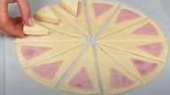 Těsto rozdělte na 12 stejných trojúhelníků. Plátky šunky vyskládejte na sebe a rovněž je rozdělte na 12 trojúhelníků. Každý kousek šunky položte na širší okraj všech kousků těsta a na šunku položte trojúhelníček taveného sýra.