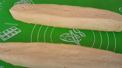 Z těsta vytvořte váleček, který rozdělte na dvě stejné části, horizontálně. Oba kousky těsta položte na tác, přikryjte je potravinovou fólií a vložte je do lednice na 30–40 minut. Mezitím připravte náplň.