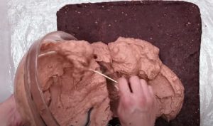 Smetanu ke šlehání vyšlehejte do šlehačky. Přidejte k ní cukr, rozpuštěnou čokoládu a prošlehejte. Pak přilijte kysanou smetanu a opět prošlehejte. Přidejte celé pražené a oloupané lískové ořechy, 200 g rozdrcených sušenek (či oplatků) a zamíchejte. Směs naneste na korpus rolády. Pak ji za pomoci fólie srolujte, zabalte ji do ní a dejte dezert na půl hodiny ztuhnout do ledničky.