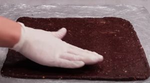 Sušenky na korpus rozdrťte úplně najemno. Můžete na to použít i mixér. Do mixéru dejte lískové ořechy a umixujte je najemno, případně použijte již mleté kupované. Sušenky a ořechy poté dejte do mísy, přidejte rozpuštěné máslo a kakao a rukou vypracujte těsto. Na stůl rozložte potravinářskou fólii, dejte na něj těsto a vytvarujte ho do tvaru obdélníku o tloušťce asi 3 až 4 milimetry a dobře uplácejte.