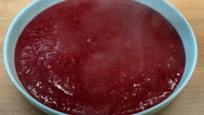 Jahody s cukrem vložte do rendlíku, zalijte je 50 ml vody a vařte 2–3 minuty. Jakmile se cukr rozpustí, směs odstavte z tepla, rozmixujte ji a vmíchejte do ní škrob, rozpuštěný v 30 ml vody.