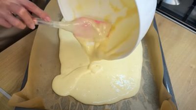 Těsto rozprostřete na plech, pokrytý pečicím papírem a pečte ho v předehřáté troubě na 180 °C po dobu 10–15 minut. Upečený korpus zabalte do čisté utěrky a nechte ho vychladnout.