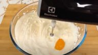 Vaječné bílky vyšlehejte se špetkou soli do pěny, do které přidejte cukr, za stálého šlehání a v několika dávkách. Asi po 7 minutách šlehání do směsi vešlehejte vaječné žloutky, jeden po druhém.