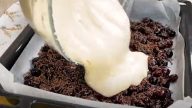 Těstem zalijte ovoce s čokoládou na plechu a dezert pečte v předehřáté troubě na 180 °C po dobu 30 minut.