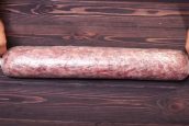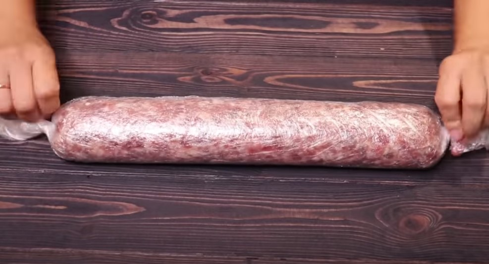 S pomocí potravinářské fólie stočte masový obdélník do pevné rolády a do fólie ji pevně zabalte. Pak roládu vložte na čtyři hodiny do mrazáku, aby zmrzla a dobře držela tvar. Když roláda dobře ztuhne, vyndejte ji z lednice a nakrájejte na kousky o šířce kolem jednoho centimetru.