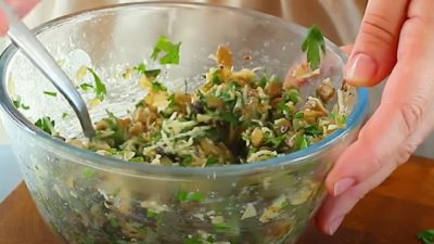 Houbovou směs smíchejte s najemno nastrouhaným sýrem a nasekanou petrželkou a naneste ji na jednotlivé plátky masa. Každé maso se směsí zarolujte a položte ho na plech, pokrytý pečicím papírem.