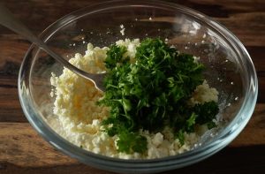 V misce si rozdrobte sýr feta na co nejmenší kousky. Nasekejte najemno zelenou petrželku a přimíchejte ji k sýru.