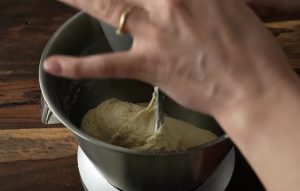 Do zadělávací mísy rozdrobte droždí, přidejte vlažné mléko, cukr a dvě lžíce mouky. Vše zamíchejte a přikryjte a počkejte, dokud se nerozeběhne kvásek. Do mísy poté přidejte crème fraîche, vodu, sůl, olej a mouku. Rukou nebo robotem těsto zpracovávejte, dokud není hladké a nelepí se. Poté mísu přikryjte a nechtě 30 minut kynout.