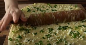 Vykynuté těsto rozdělte na dvě poloviny. Z té první vyválejte na pomoučněném válu obdélníkovou placku. Vrchní stranu placky namažte polovinou množství změklého másla. Poté vezměte sýr s petrželku a půlku daného množství rozprostřete na vrchní část placky. Poté sýr za pomoci válečku vtlačte do těsta. To poté nakrájejte na stejně široké pruhy zhruba 4 centimetry široké.