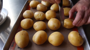 Brambory oškrábejte nebo vydrhněte kartáčem. Vložte je do hrnce s vodou, přidejte sůl a uvařte je. Čas od času zamíchejte a počkejte, než budou měkké. Měly by být lehce rozvařené, aby byla další příprava jednodušší. Vodu z uvařených brambor slijte a nechte je vychladnout na pokojovou teplotu. Pokud jste je vařili se slupkou, každý brambor kolem dokola nařízněte.