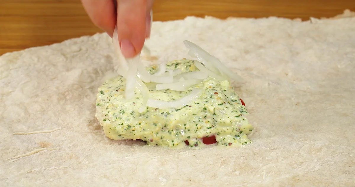 Nakrájejte pita chleba na proužky, do středu každého položte plátek rajčete, poté rybu, ještě trochu omáčky a nakonec zbývající marinovanou cibuli.